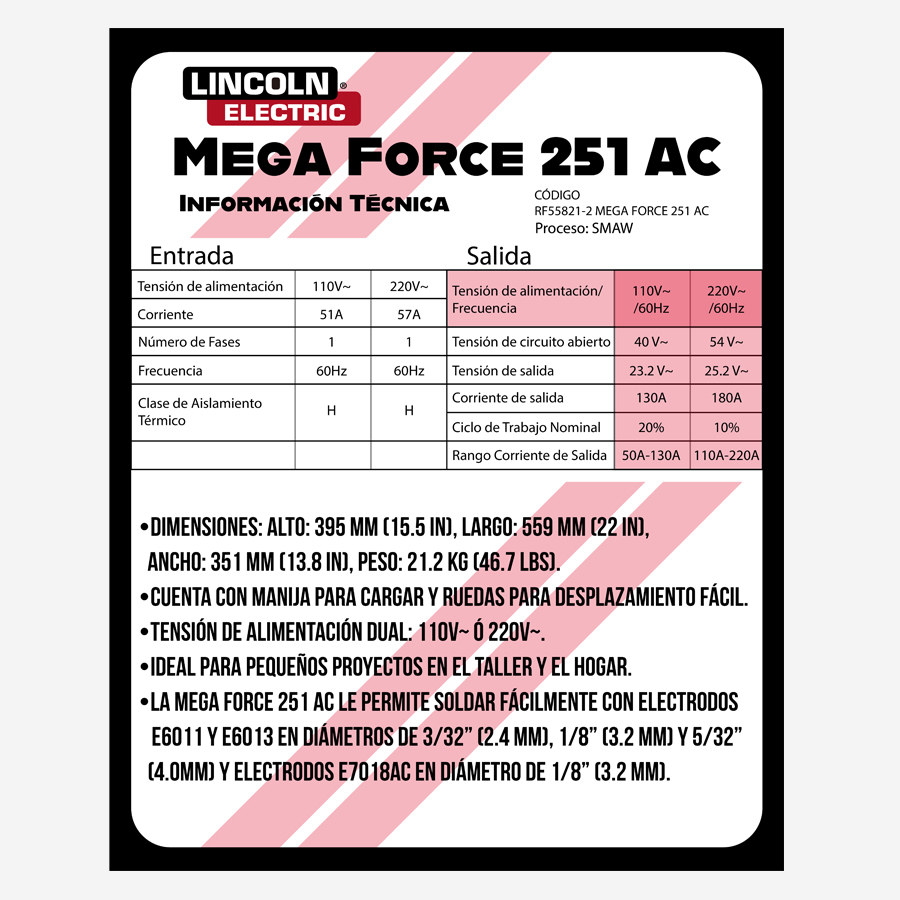 • Incluye 1kg de electrodos E6011 1/8” Lincoln Electric