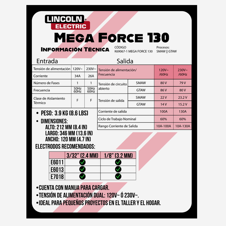 • Suelda electrodos 6011, 6013 y 7018 con diámetros hasta 1/8”