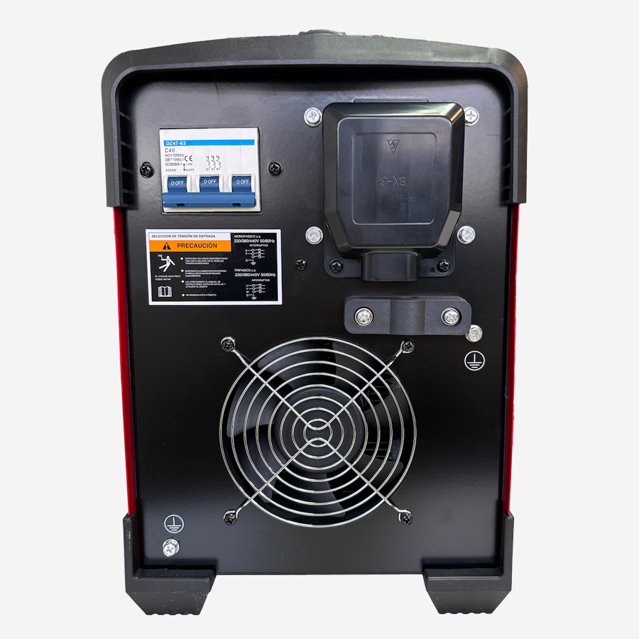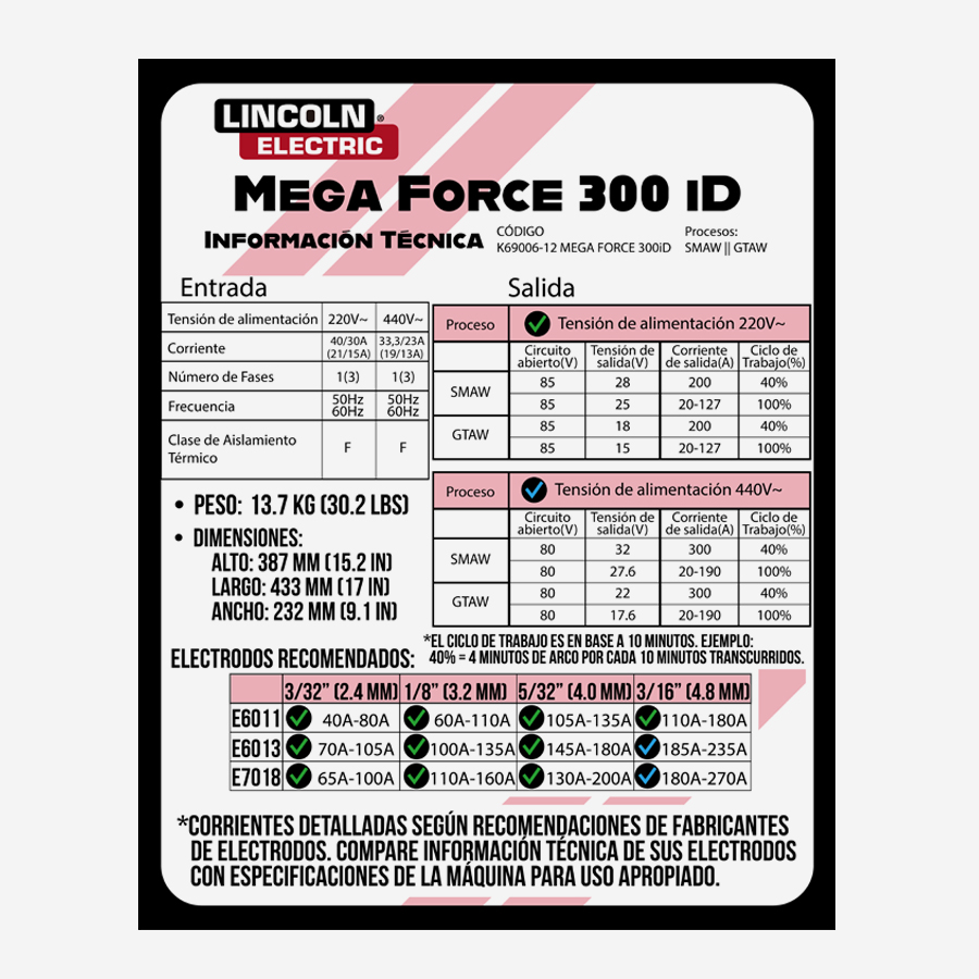 • Ciclo de trabajo 100% al soldar 5/32″ con entrada 440V~